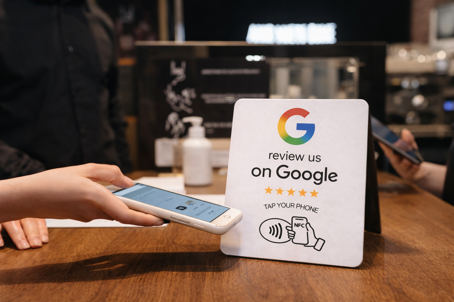 Tap-to-review NFC cards that turn happy customers into real reviews in seconds.